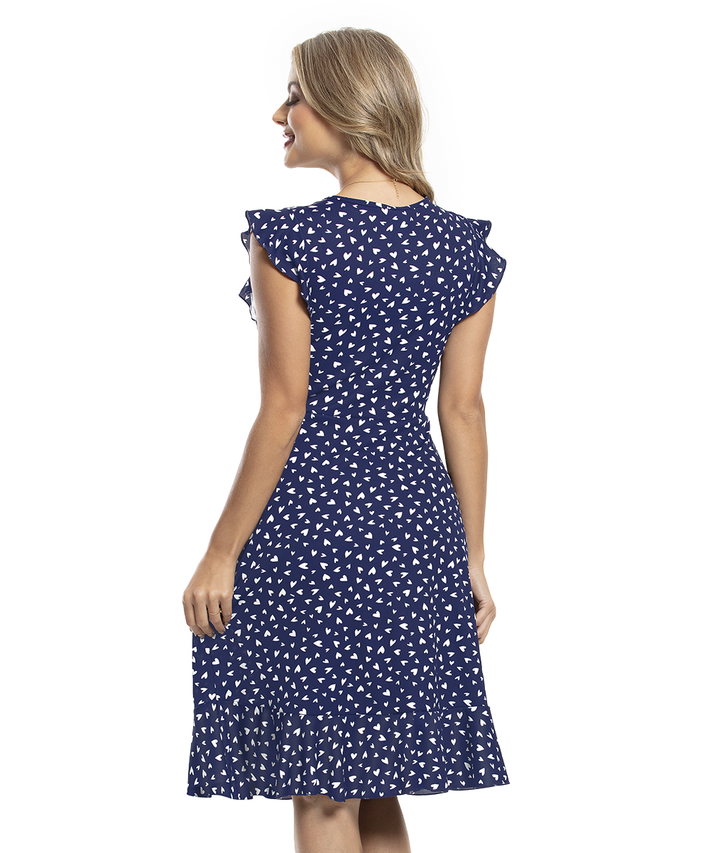 Vestido decote quadrado, mangas com babado delicado. Modelagem da saia