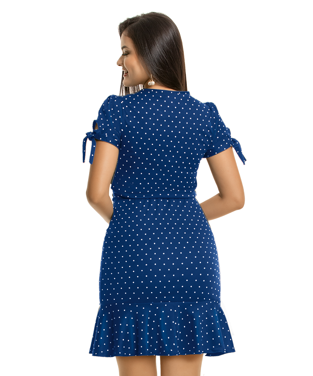 A estampa marinho com poá branco e a amarração nas mangas traz um ar de romantismo ao look, que fazem esse modelo ser um dos queridinhos do nosso catálogo. Feito em malha jersey, possui toque suave à pele e caimento fluído perfeito. Possui detalhe no decote, mangas franzidas e com amarração, recorte na cintura e saia com babado.