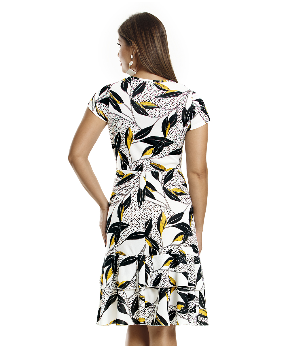 Vestido em jersey acetinado possui decote com pala, mangas curtas, modelagem solta ao corpo, saia com babados sobrepostos. Comprimento Clássico.