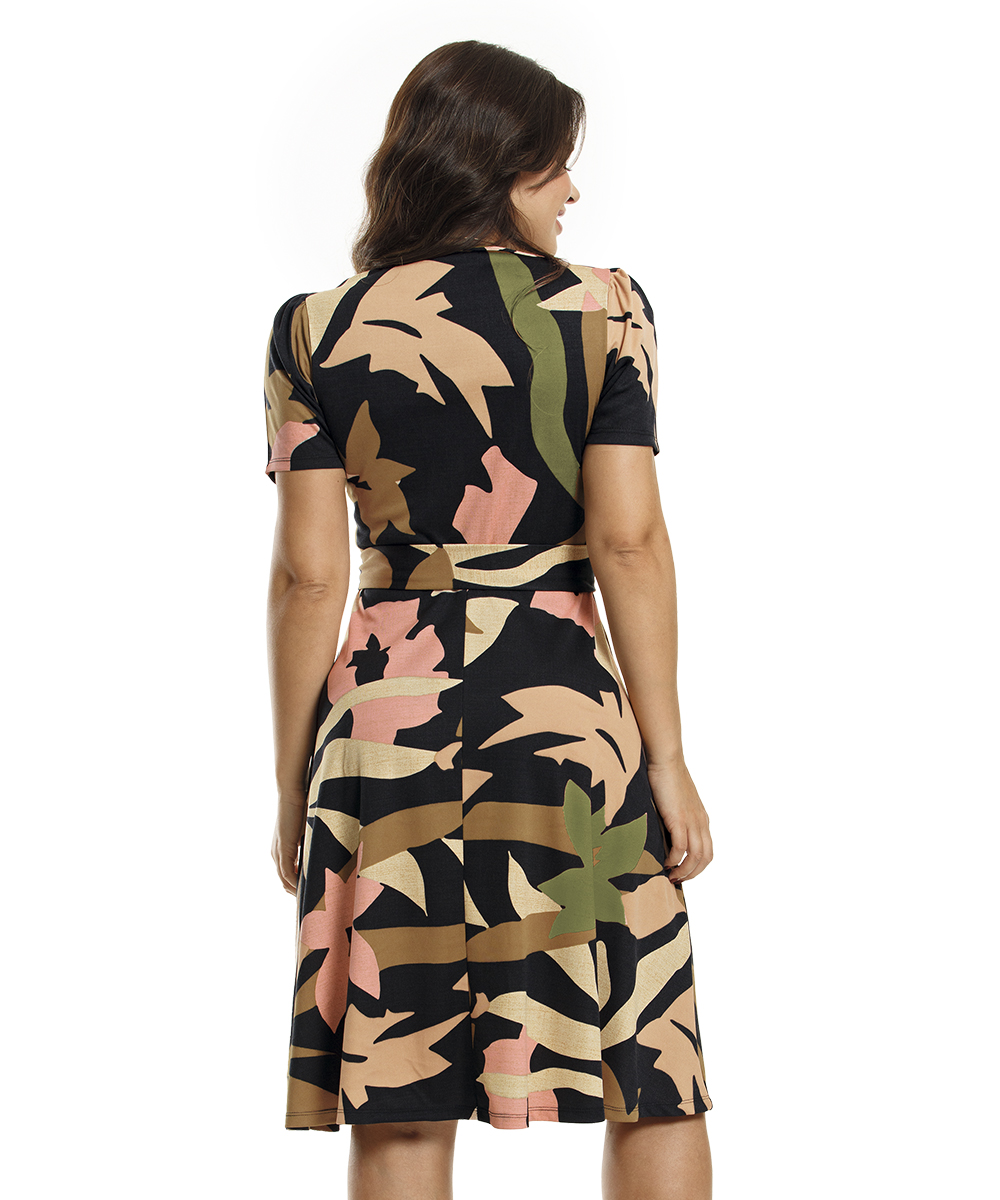 O modelo é tradicional e discreto, mas a estampa vibrante que se destaca sobre o fundo escuro vem para equilibrar o look e trazer movimento à peça. Use e arrase!