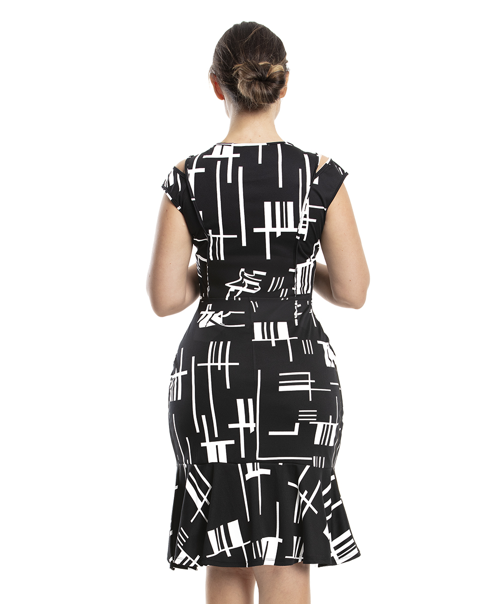 Vestido decote redondo, sem mangas com detalhe no ombro vazado. Modelagem