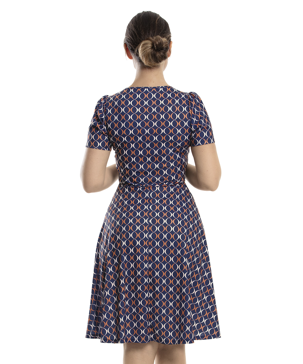 Vestido decote v, mangas curtas, franzido no ombro, faixa embutida com