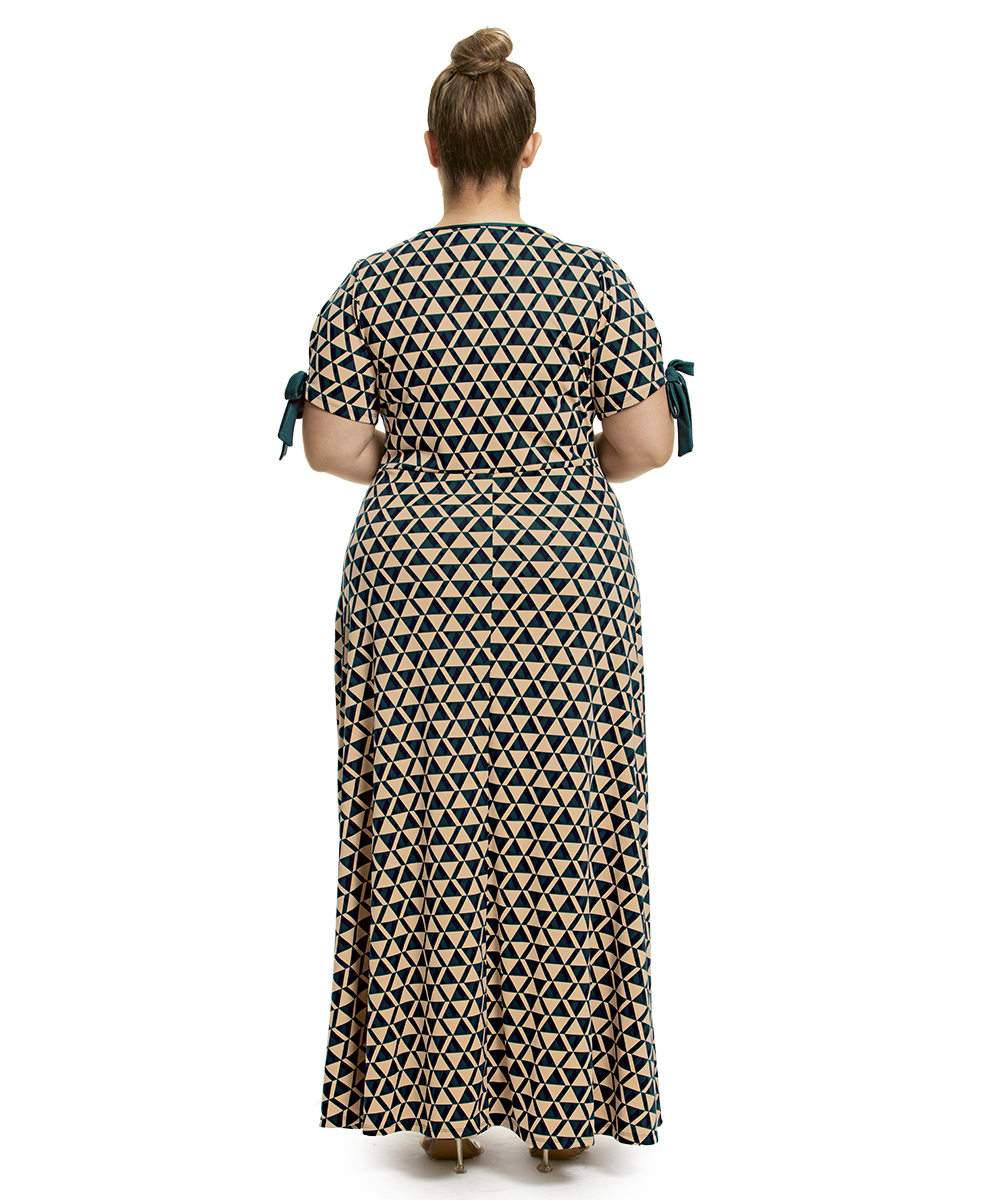 Possui mangas curtas com abertura discreta. Possui faixa para amarração e modelagem da saia godê. Comprimento Longo.