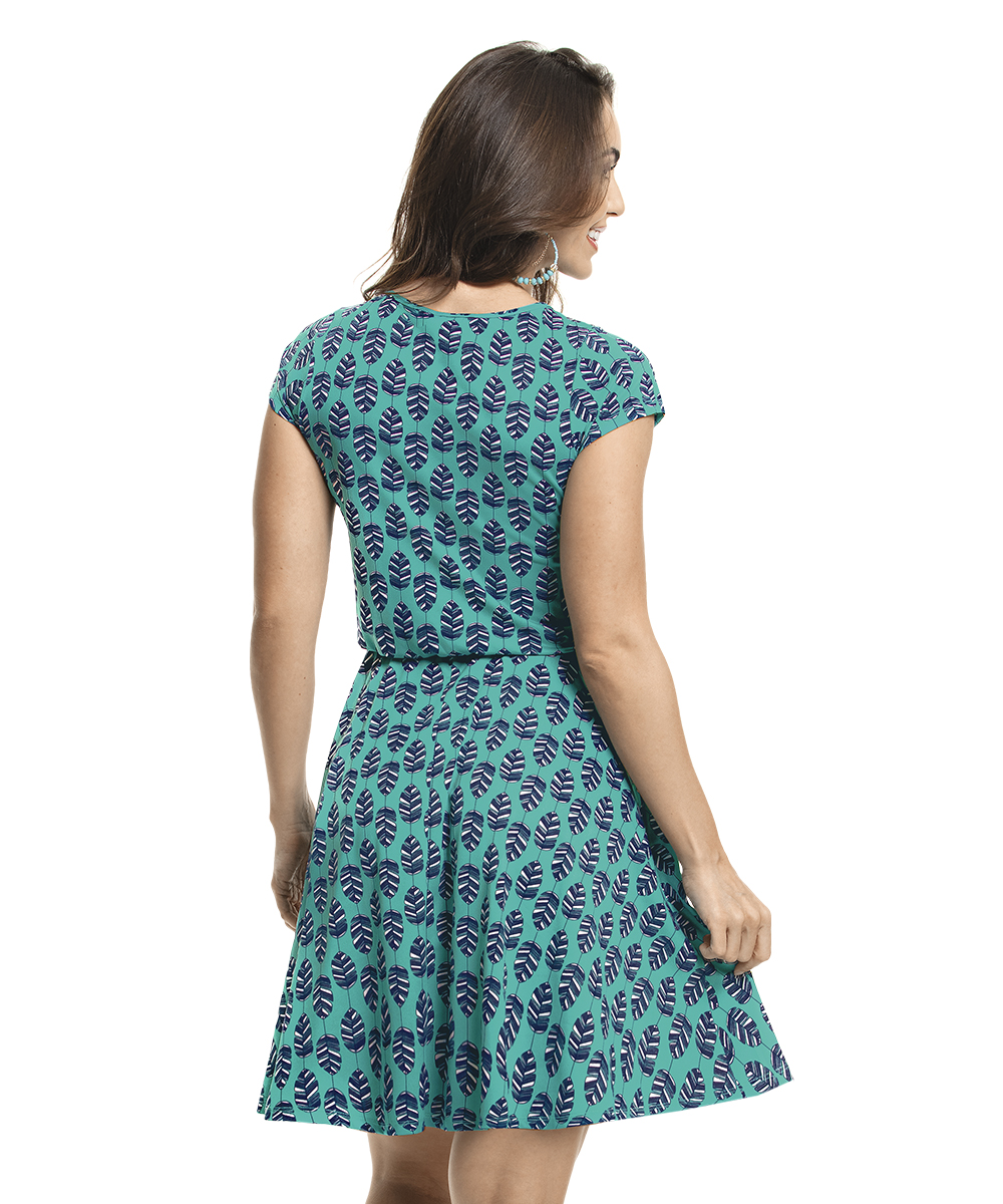 Vestido possui decote redondo, mangas curtas, elástico na cintura para efeito blousê, faixa embutida com ponteiras e modelagem da saia godê. Comprimento Médio.