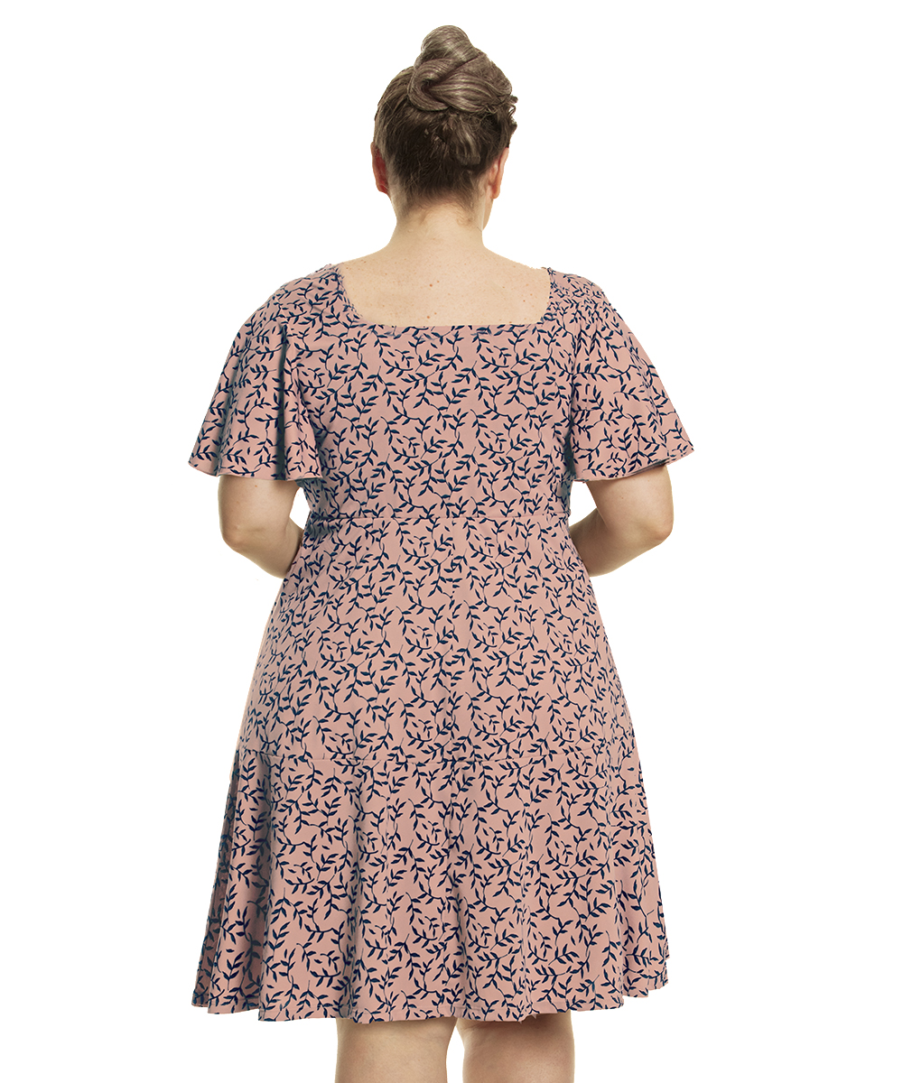 Vestido possui decote quadrado com mangas godê, busto forrado e modelagem da saia godê. Comprimento Clássico.