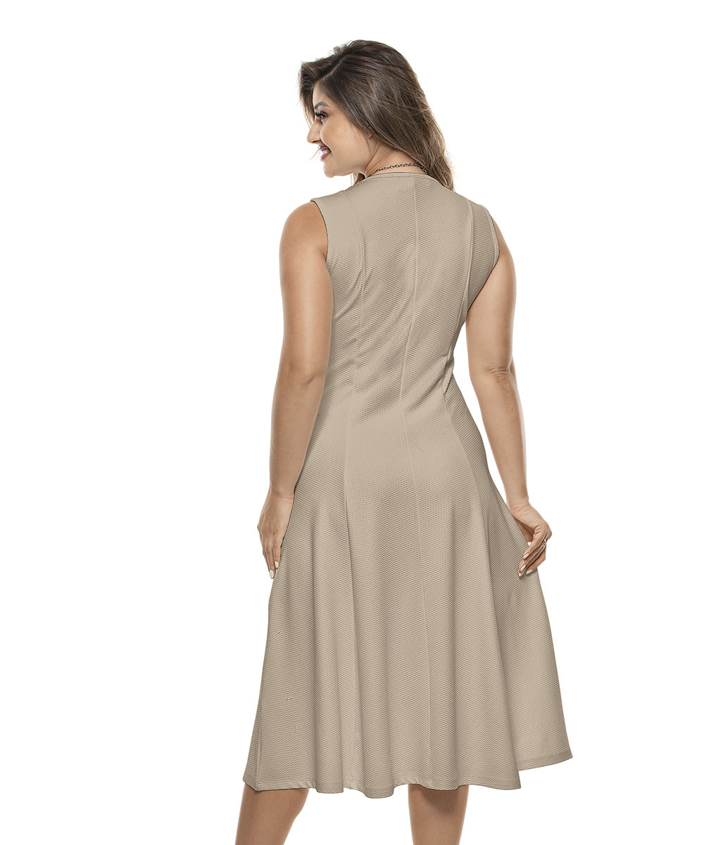 Feito em malha colmeia possui decote redondo sem mangas, recortes frontais e saia godê. Comprimento Clássico.