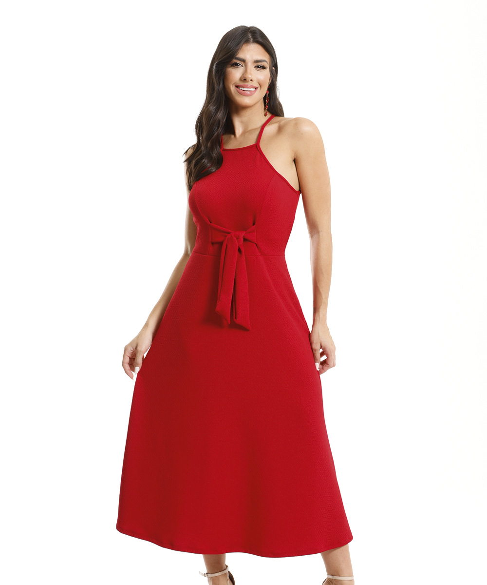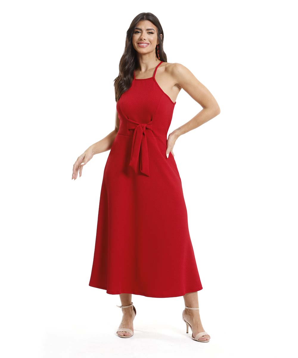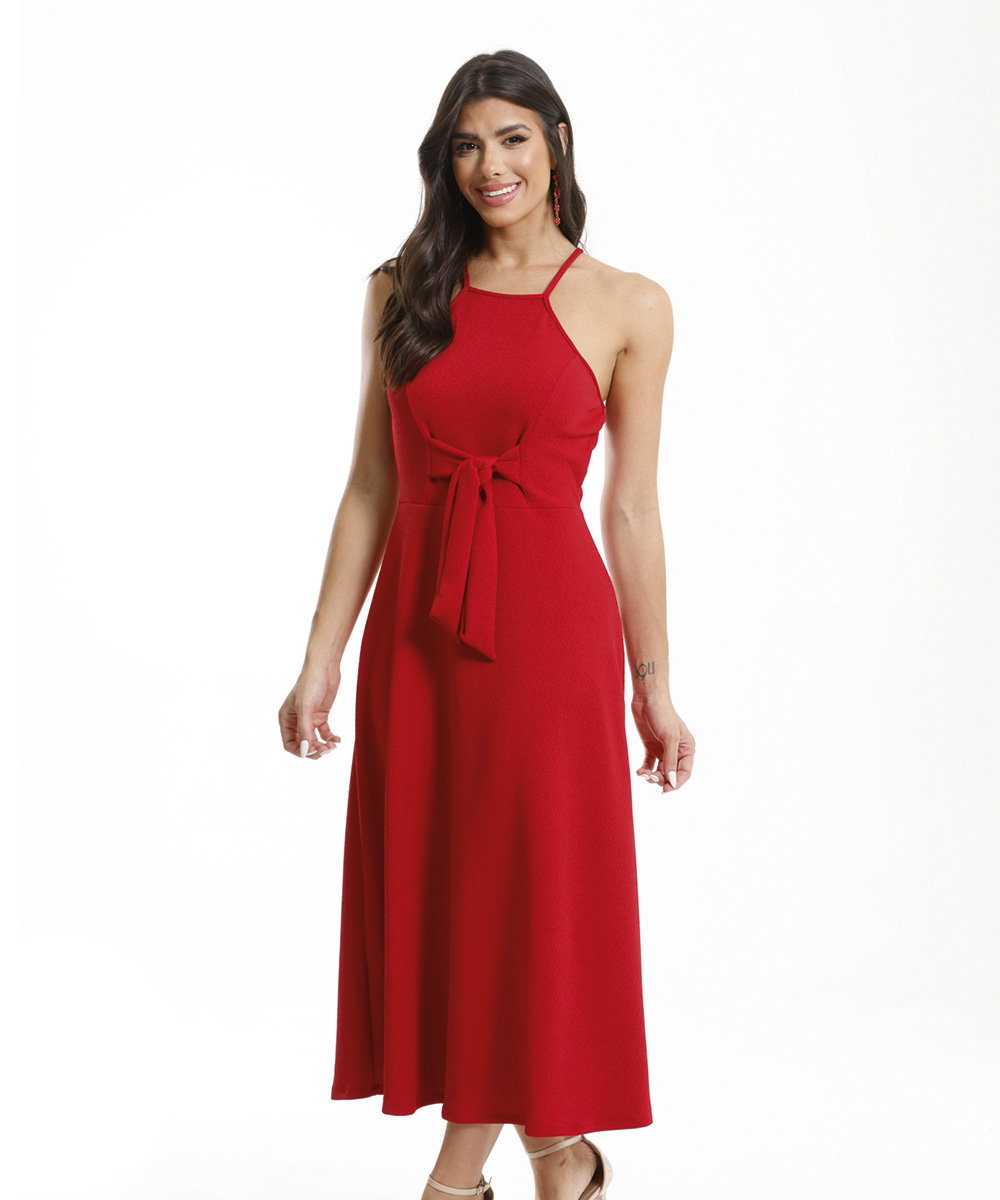 Decote reto, justo no corpo, com detalhe de amarração no centro e saia godê. Comprimento Max