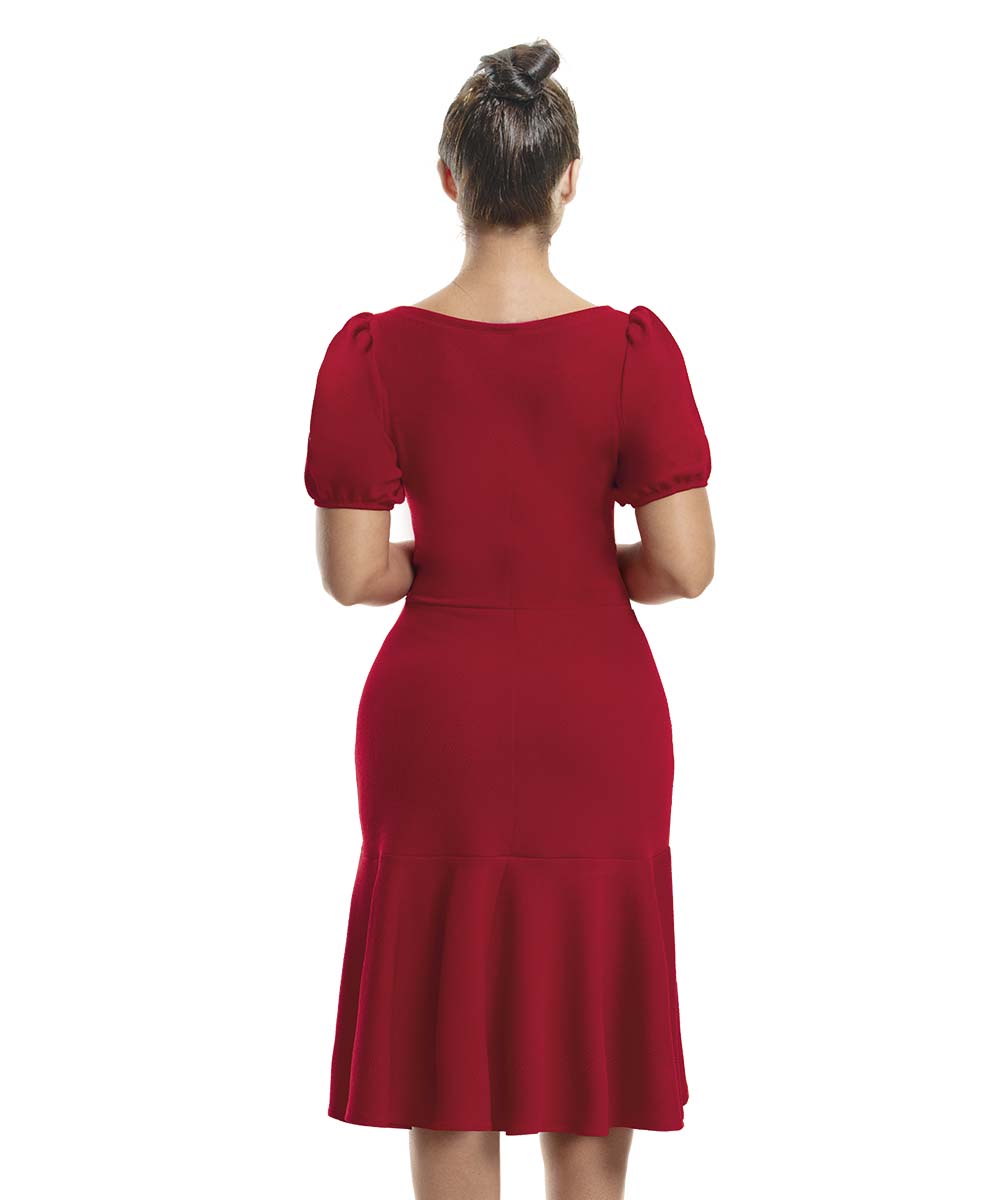 Esse vestido é o modelito perfeito para ser usado em diversas ocasiões, pois além de uma linda cor sólida, possui decote discreto e mangas levemente bufantes. A saia levemente justa ao corpo com babado e a malha crepe proporcionam um ótimo caimento. Comprimento Clássico.