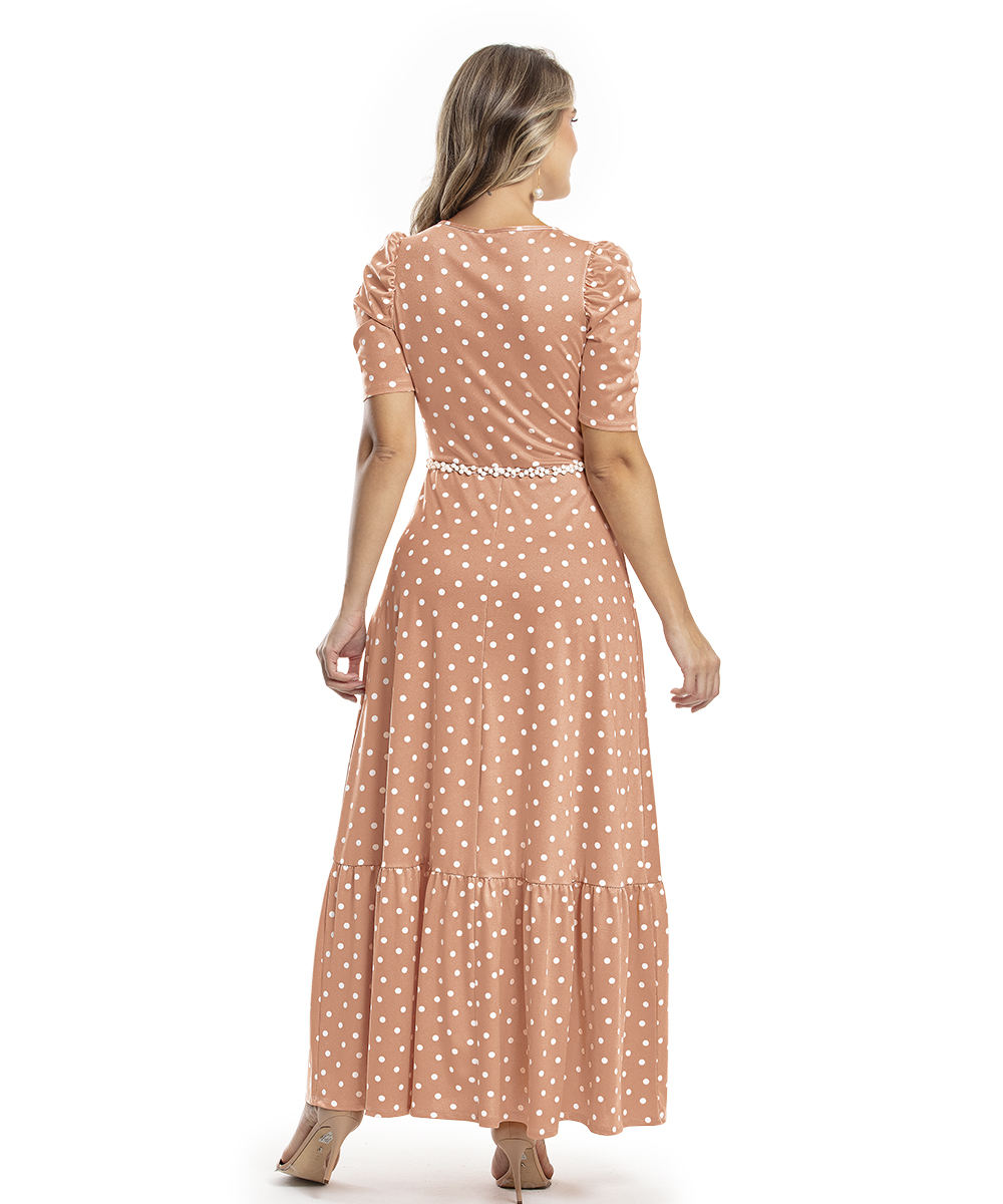 Vestido decote v, mangas antes da dobra do braço bufantes. Modelagem da