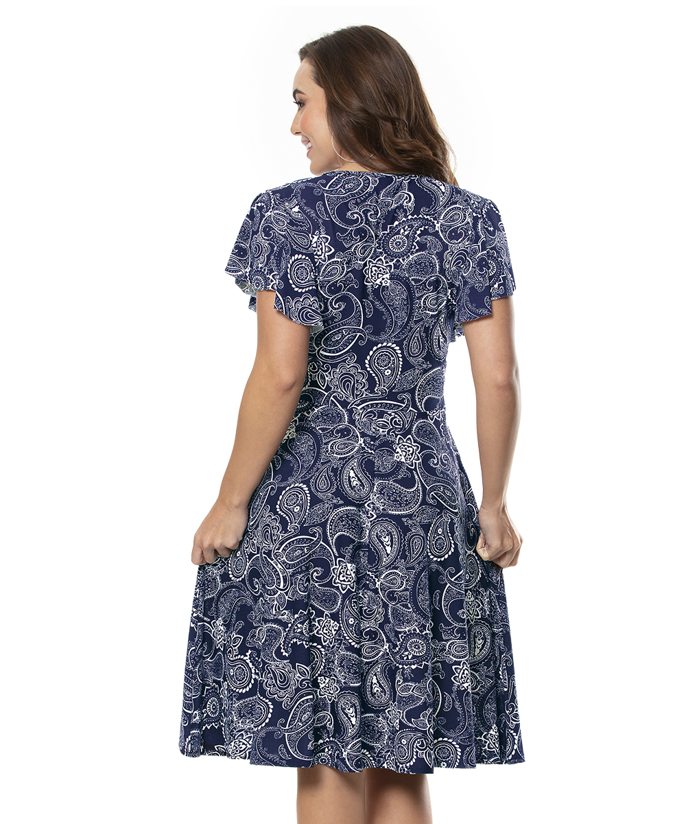 Vestido feito em malha crepe, possui decote V, mangas godê e modelagem da saia godê. Comprimento Clássico.
