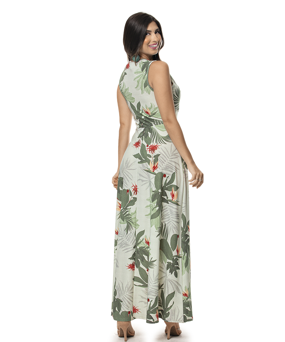 Floral, suave e elegante em nosso vestido encantador! Com decote V e sem mangas, o busto forrado oferece conforto, enquanto a pala abaixo do busto e o recorte na cintura adicionam um toque de refinamento. A modelagem da saia é godê, proporcionando um movimento fluido e gracioso. Em comprimento longo, este vestido é perfeito para celebrações que exigem estilo e delicadeza.