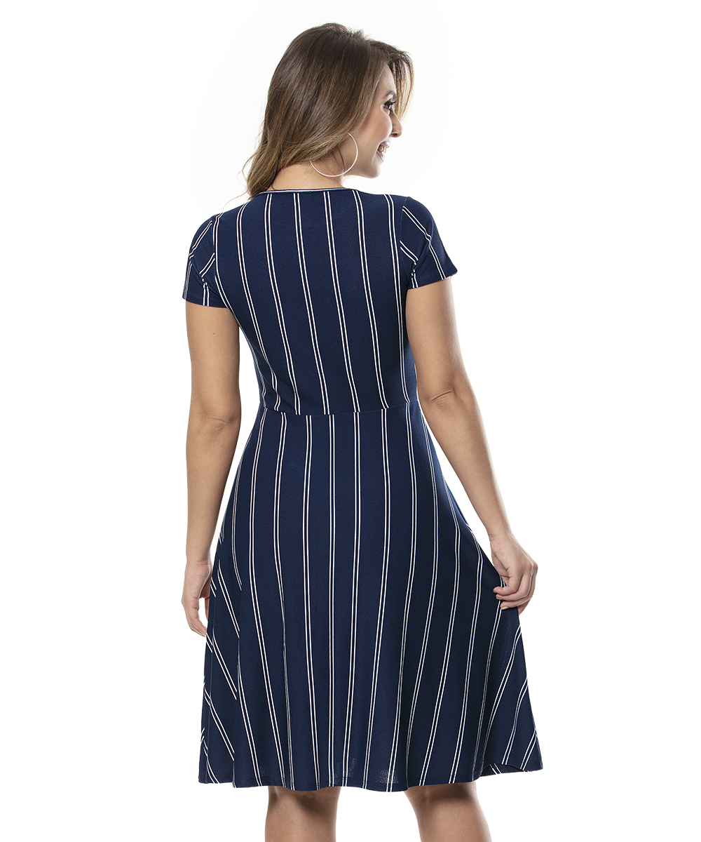 Aqui o vestido vem em malha crepe, possui decote redondo, mangas curtas e modelagem da saia evasê. Comprimento Clássico.