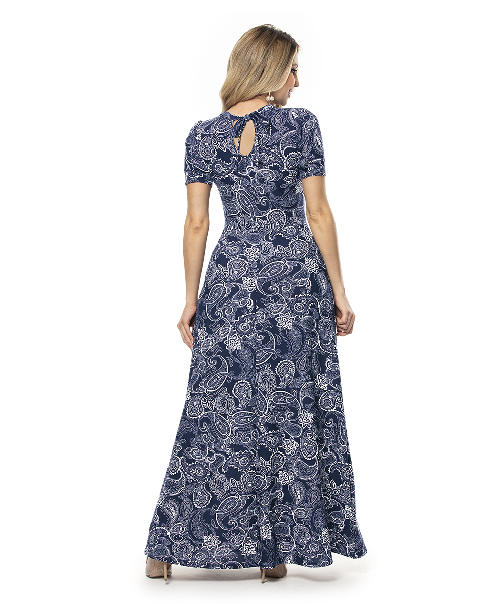 O vestido longo com a modelagem da saia godê é feminino e delicado na medida certa.