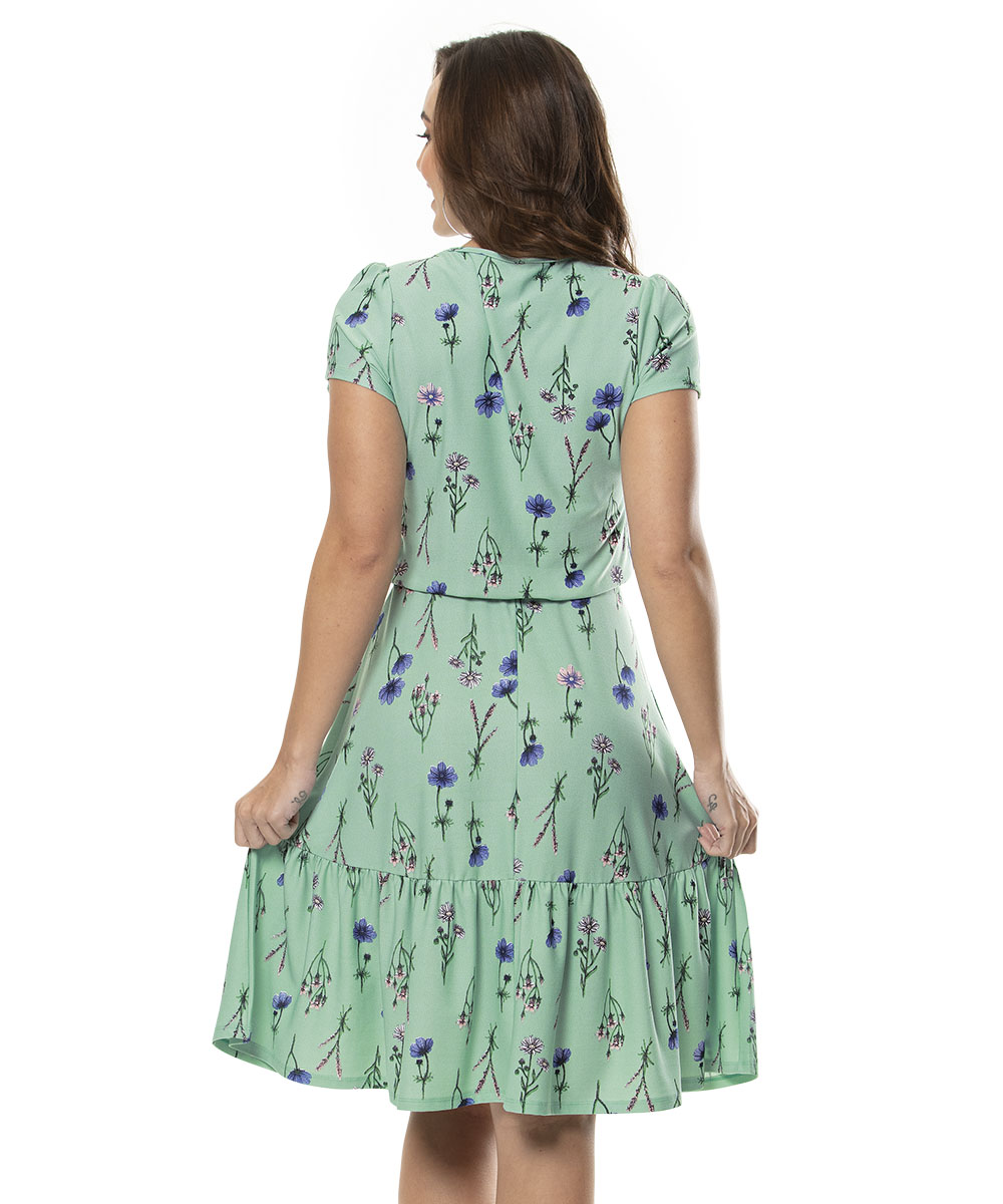 Este vestido apresenta um decote V, mangas curtas e modelagem da saia godê com babado franzido. Comprimento Clássico.