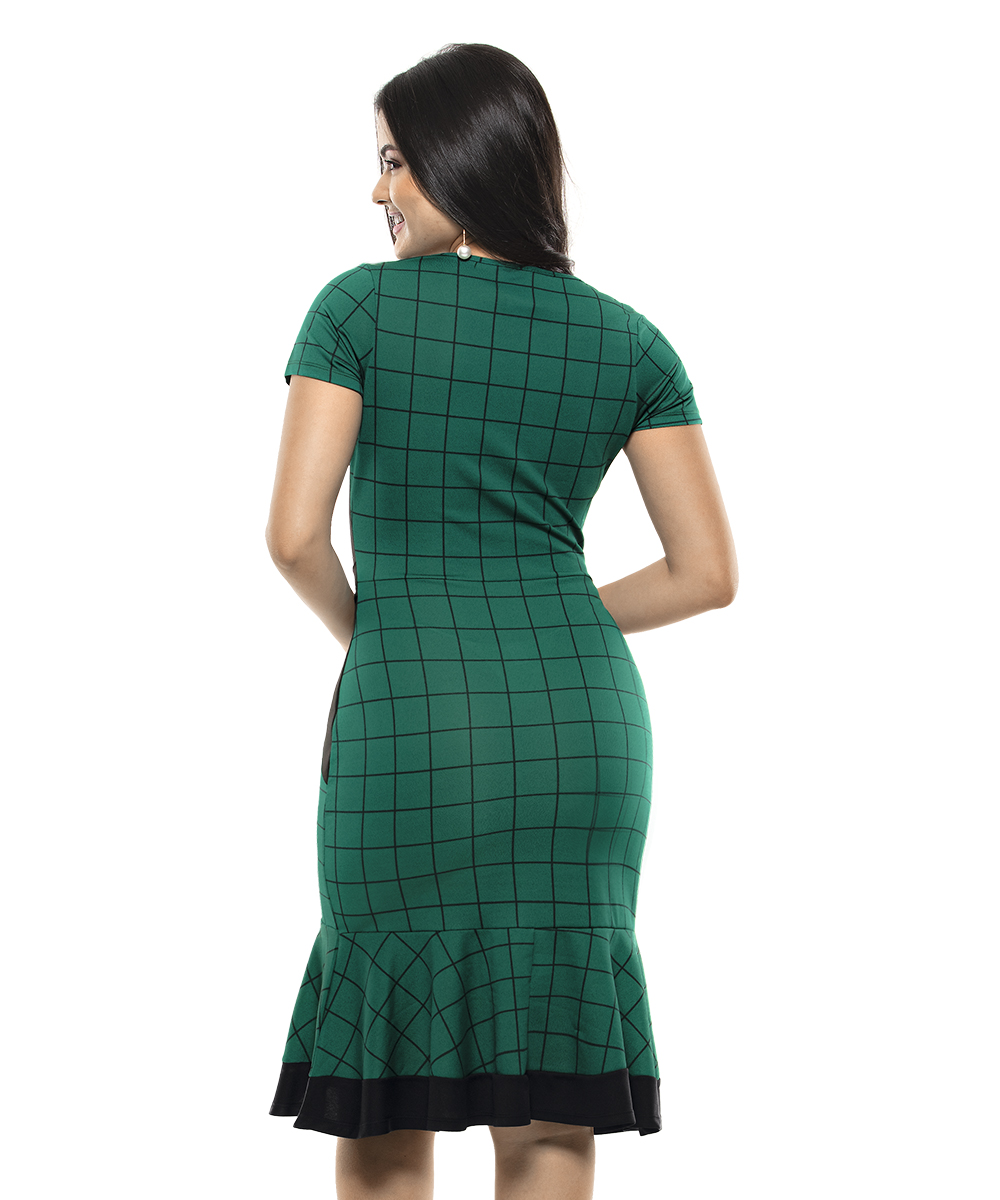 Vestido com decote redondo, mangas curtas, detalhes contrastantes nas laterais e cintura. Saia Modelagem justa com babado. Comprimento Clássico.