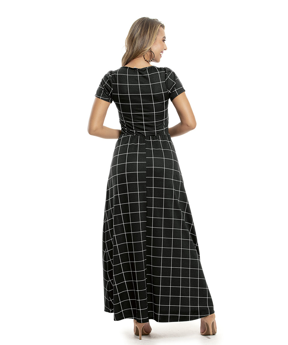 Vestido com decote reto e abertura discreta, mangas na dobra do braço, franzido na cintura. Modelagem da saia godê. Comprimento Longo.