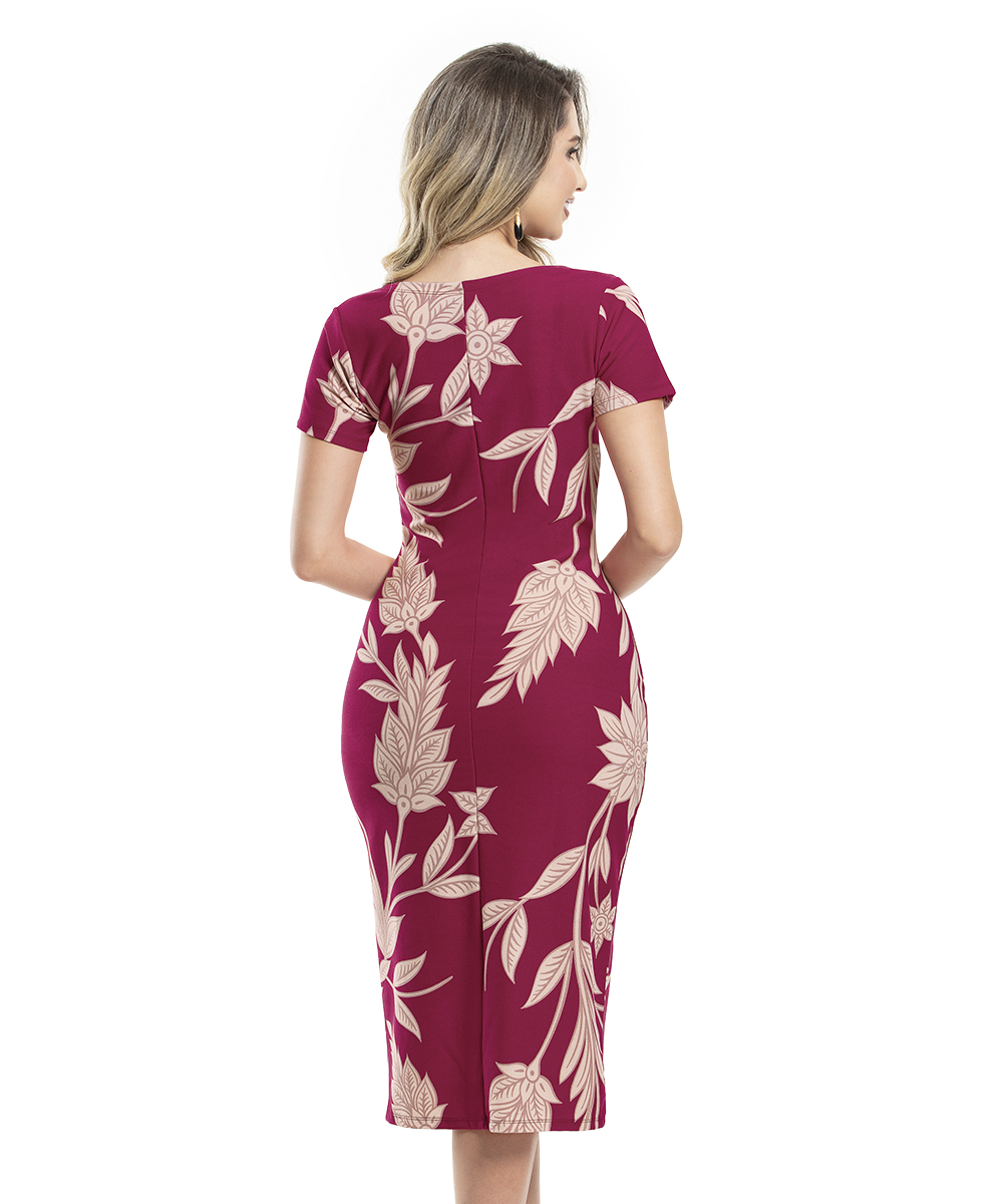 Vestido decote v, mangas curtas, botões decorativos. Modelagem da saia
