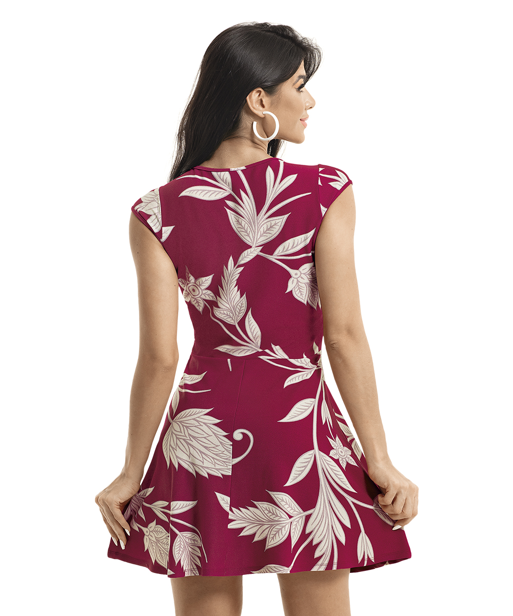 Detalhe de abertura no decote, mangas japonesas, saia godê. Comprimento Básico.