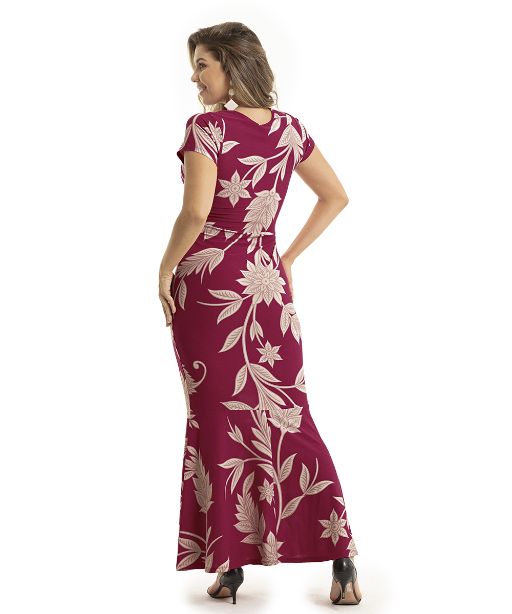 Feito em malha crepe com toque agradável ao corpo e caimento delicado. Possui decote diferenciado, modelagem ajustada ao corpo e saia sereia. Comprimento longo.