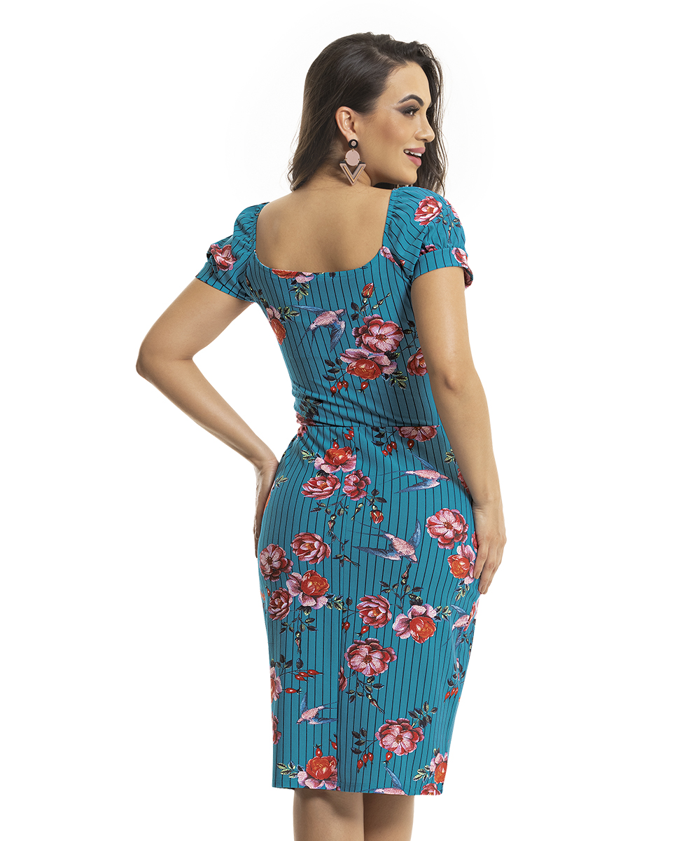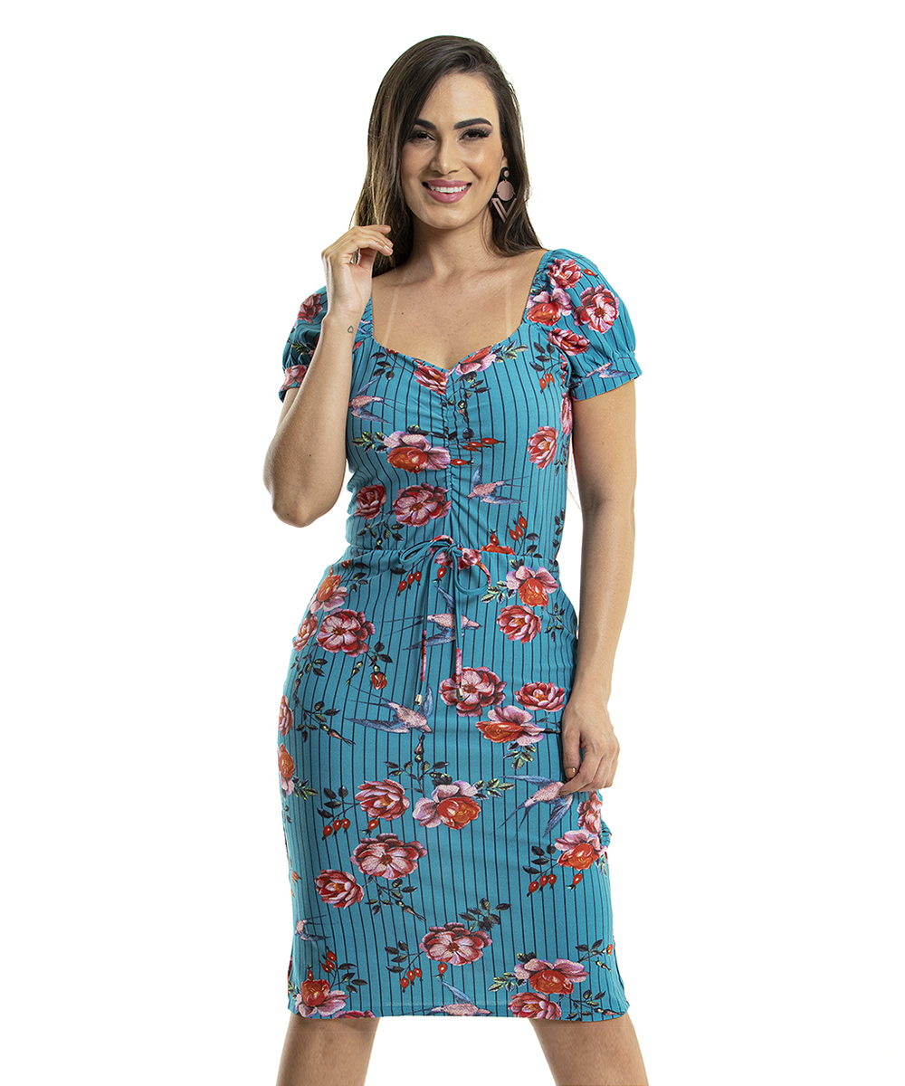 Vestido justo feito em crepe, possui mangas bufantes e franzido no decote. Comprimento clássico.