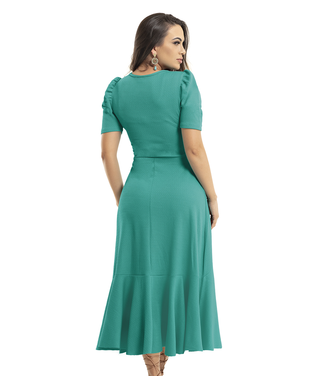 Vestido com decote coração, mangas franzidas, saia com babado em godê assimétrico trazendo movimento e com cintura marcada pelo falso cinto, são elementos que deixam este vestido elegante e moderno.