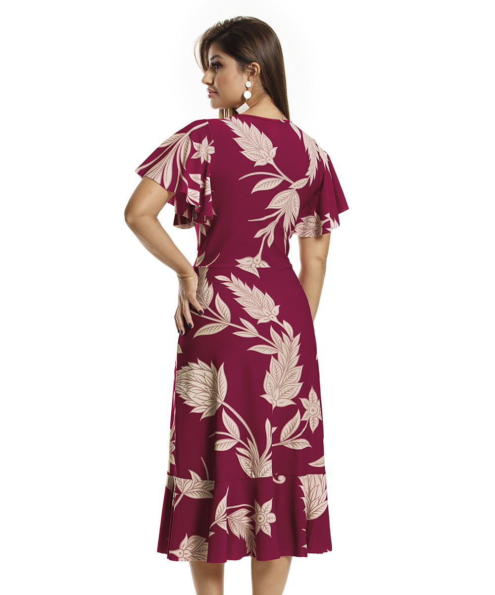 Vestido em malha crepe com decote V, mangas godês, modelagem da saia godê e com babado sobreposto. Comprimento Midi.