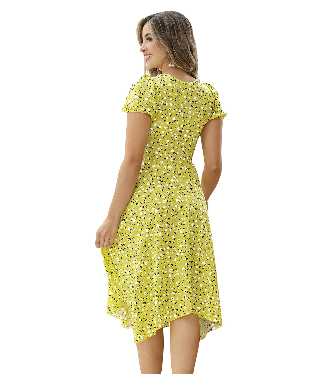 A alegria da cor amarela combina super bem com esse vestidinho leve e descontraído. Com estampa delicada, barra assimétrica e modelagem soltinha no corpo, ele é puro charme!