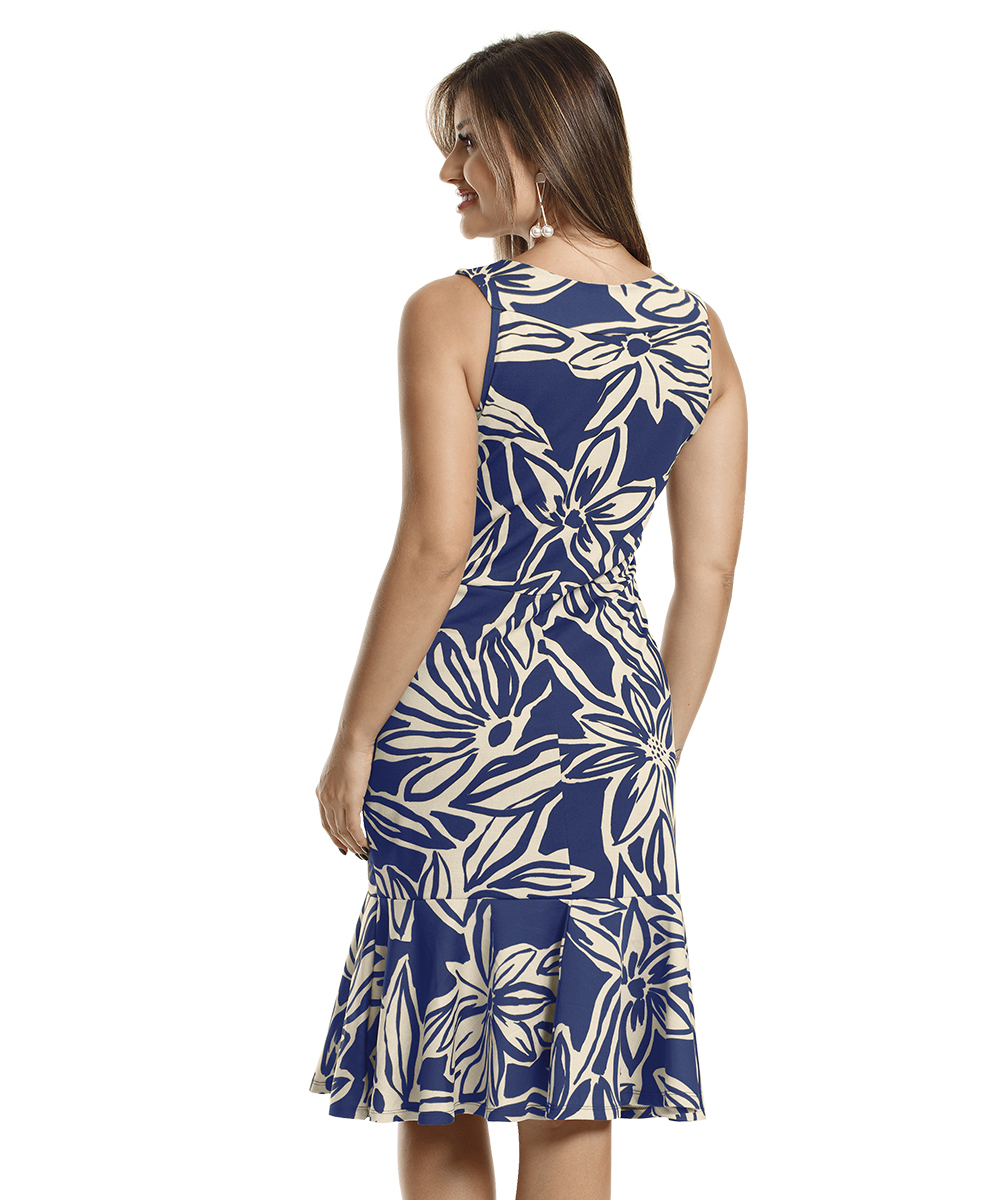 O maravilhoso tom de azul e a belíssima estampa floral na cor branca proporcionam a esse vestido o contraste perfeito. Além disso, o comprimento até o joelho com saia de babado sereia ressaltam a elegância do look.