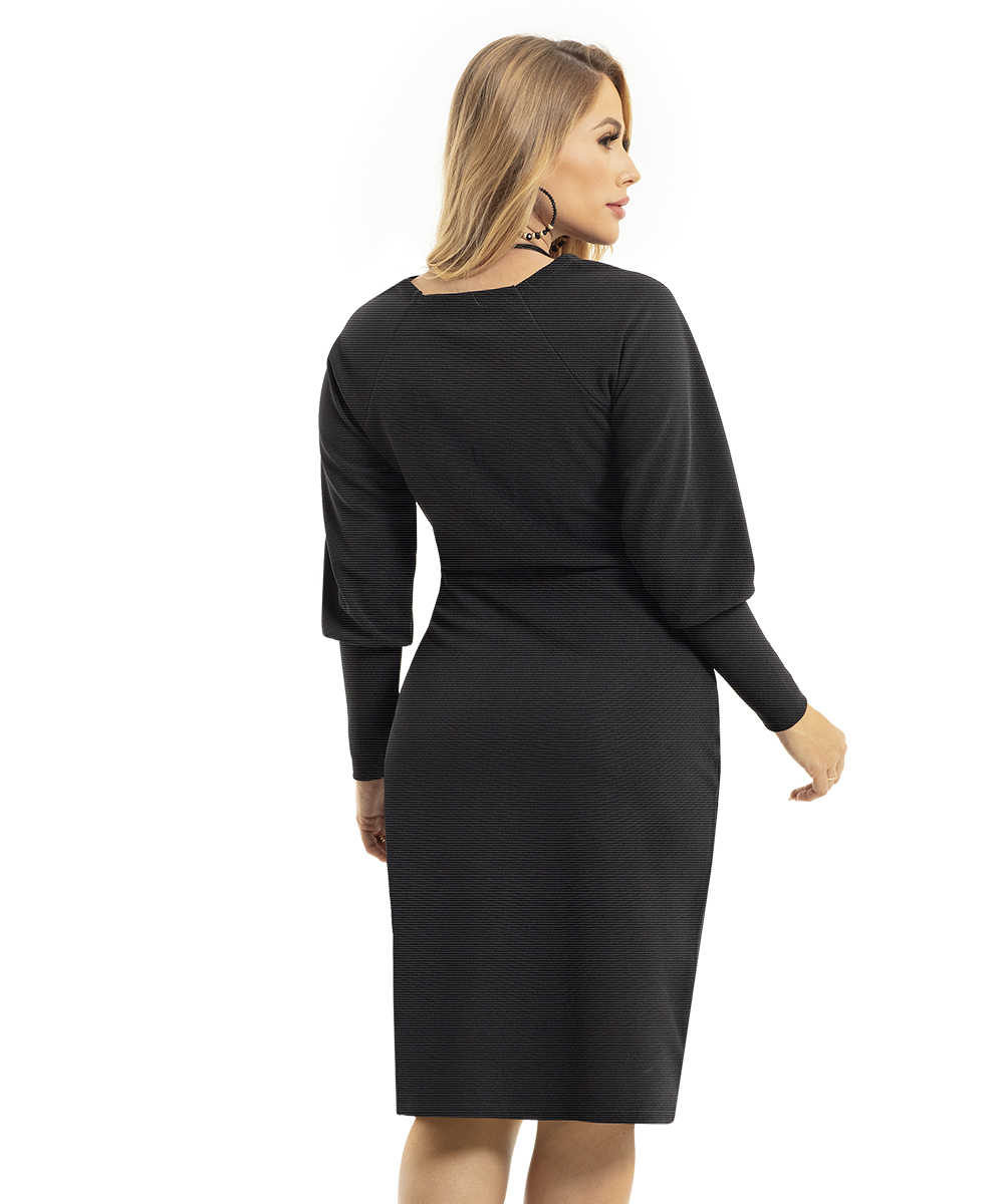 Vestido com blousê feito em malha canelada encorpada, mangas longas com punho largo, recorte na cintura e saia afunilada na barra. Comprimento clássico.