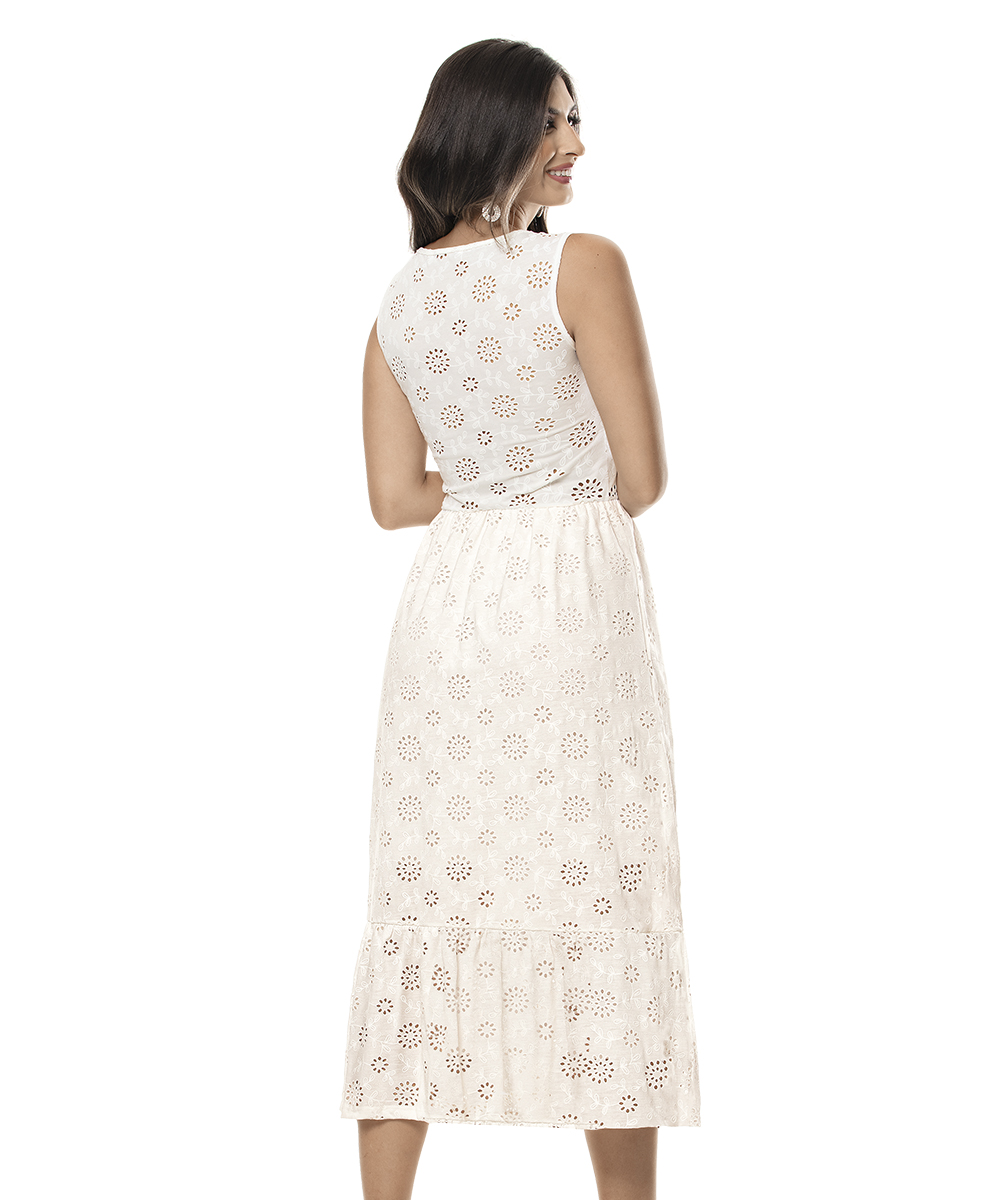 Feito em malha laise, possui elástico na cintura, modelagem da saia evasê, com forro até o joelho e babado. Comprimento max.