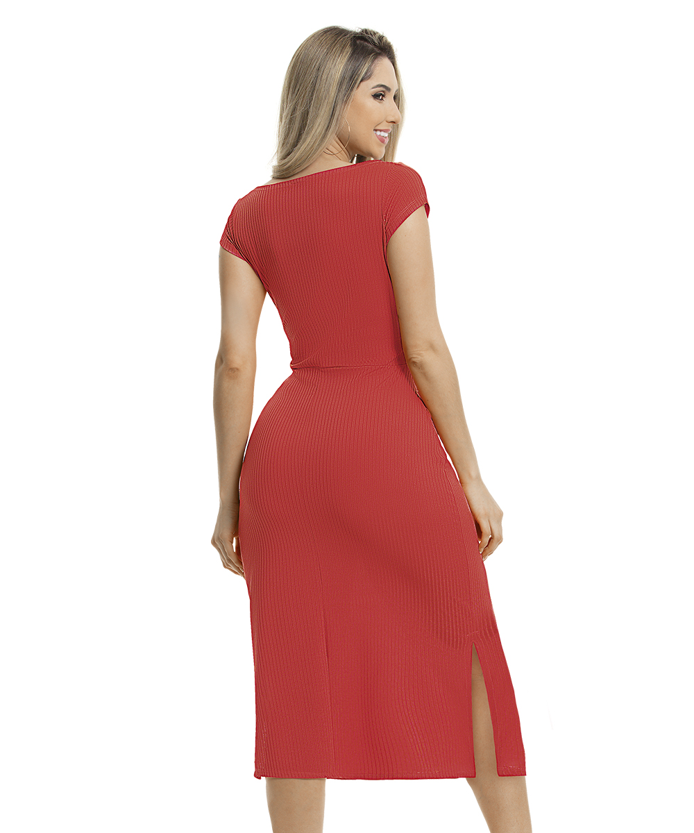 Vestido possui decote canoa, mangas copinho, detalhe torcido na cintura e modelagem da saia justa com fendas laterais. Comprimento Midi.