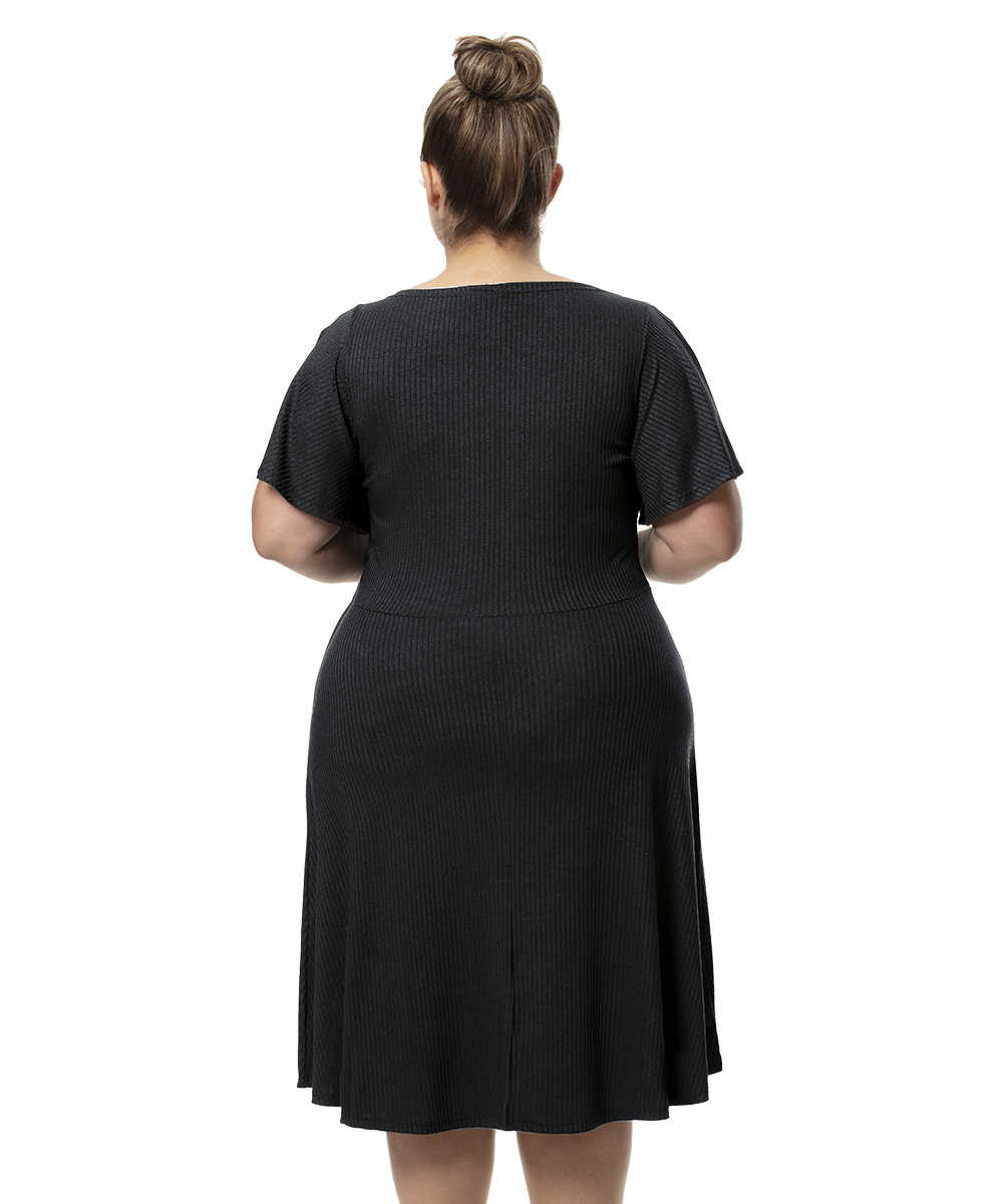 Vestido com decote canoa, mangas godê com fenda, saia modelagem godê.
