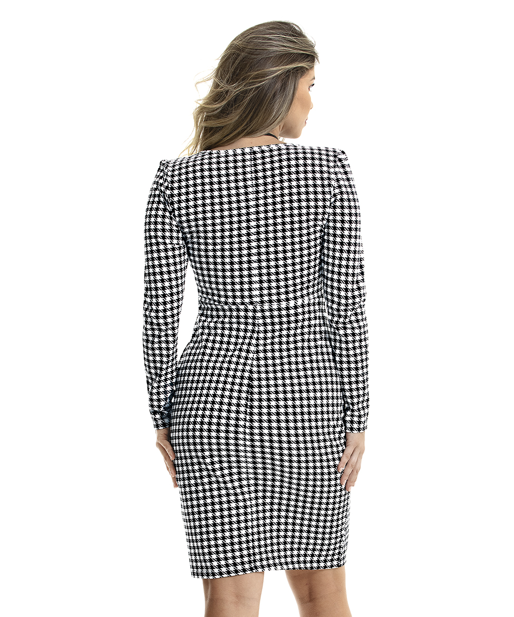 Vestido com decote quadrado, mangas compridas e modelagem próxima ao corpo. Comprimento clássico.