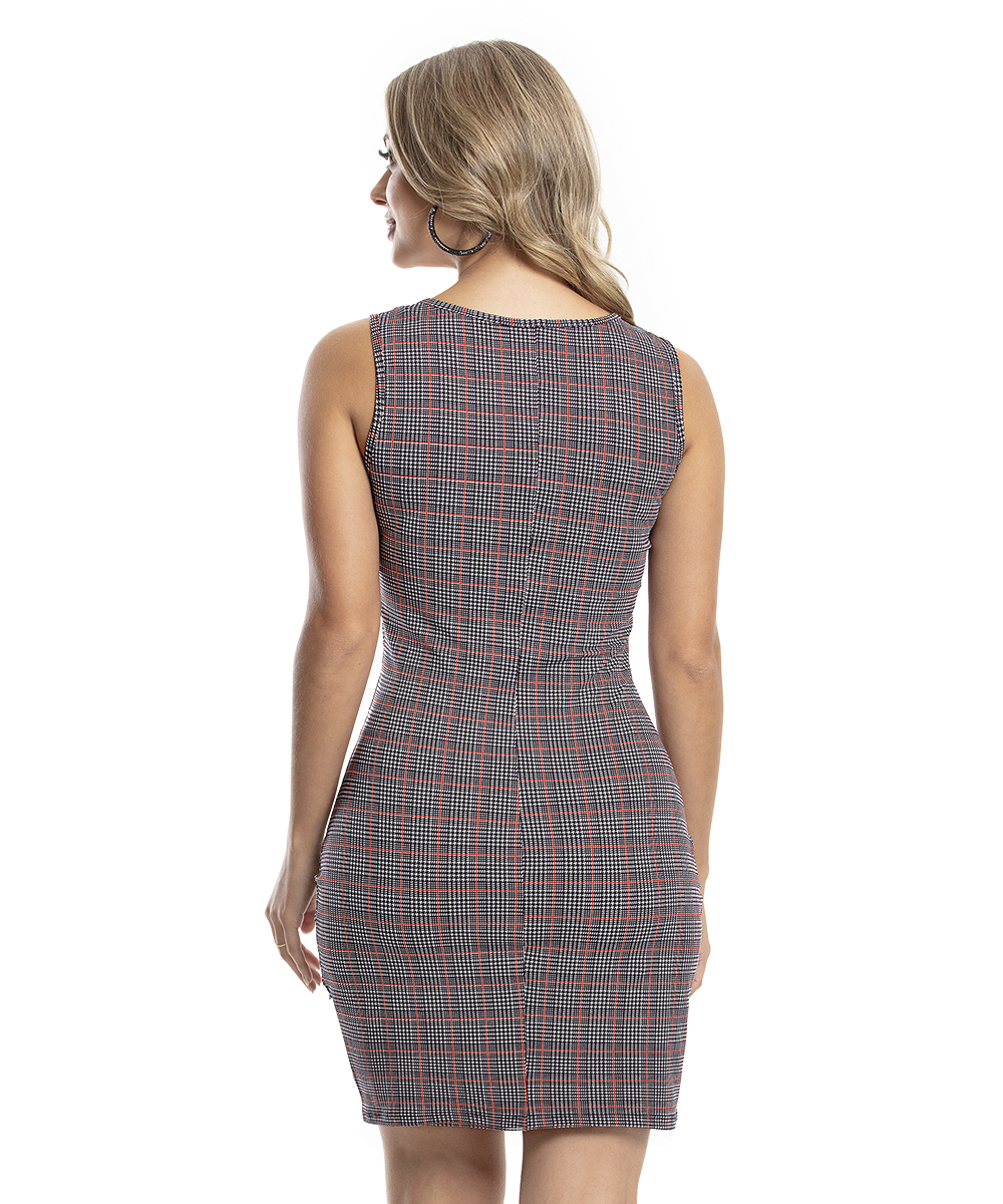Vestido decote redondo, sem mangas. Modelagem da saia justa. Comprimento