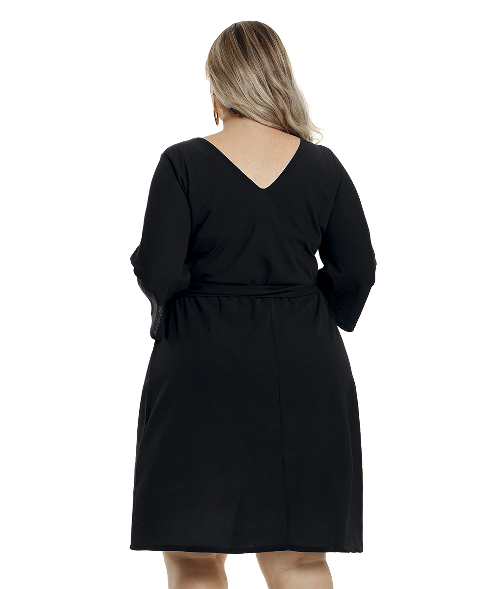 Vestido possui decote v, busto forrado, mangas 7/8 e modelagem reta. Acompanha faixa com argola. Comprimento clássico.
