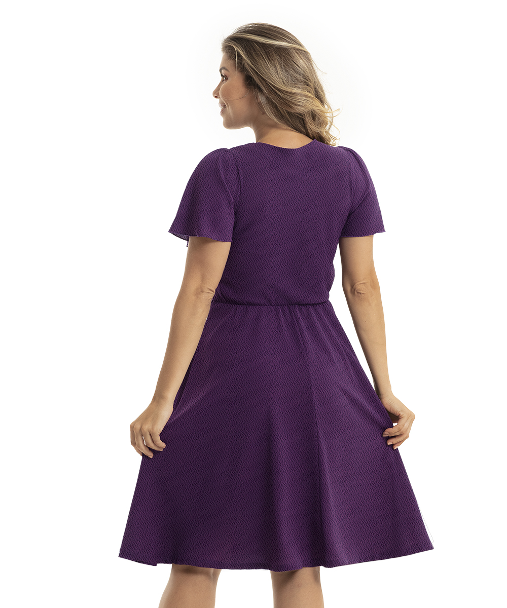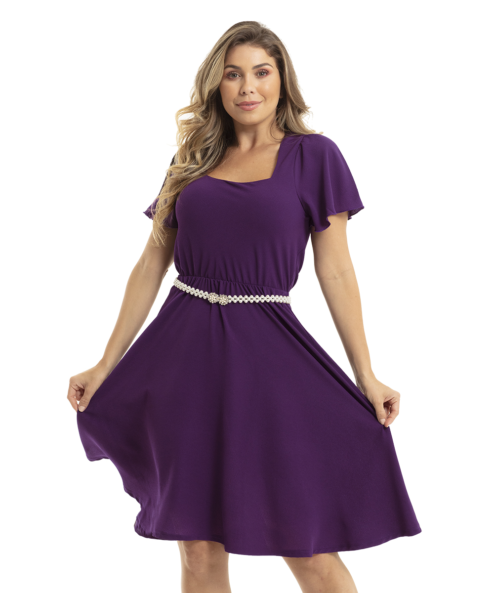 Feito em crepe, que dá um ar sofisticado na peça e um bom caimento, possui decote quadrado e saia rodada.