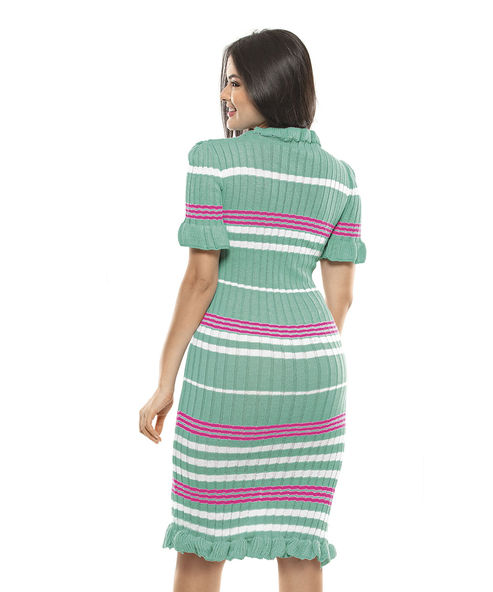 Esse modelo em tricot possui babados nas mangas e na barra da saia, realçando ainda mais a silhueta. Com listras na horizontal é perfeito pra quem quer se sentir mais alongada.