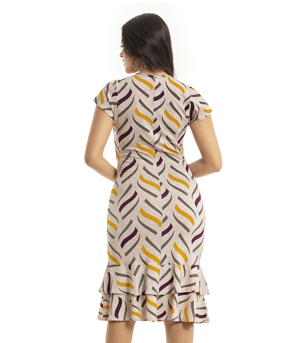 Nesta estampa de tons suaves e harmoniosos, com decote diferenciado e mangas curtas, este vestido se destaca na coleção.