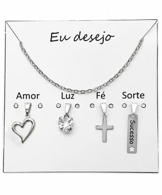 • Conjunto de Corrente com 4 pingentes Desejos em aço inox com zircônia