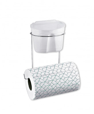 • Suporte para rolo de papel toalha em arame cromado com saleiro em plástico